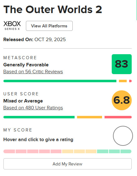 《天外世界2》今年10月30日發(fā)售,簡(jiǎn)體中文評(píng)價(jià)褒貶不一,597篇評(píng)價(jià)中只有63%的用戶給出好評(píng)。在Metacritic上,該作的用戶評(píng)分差不多,為6.8分。