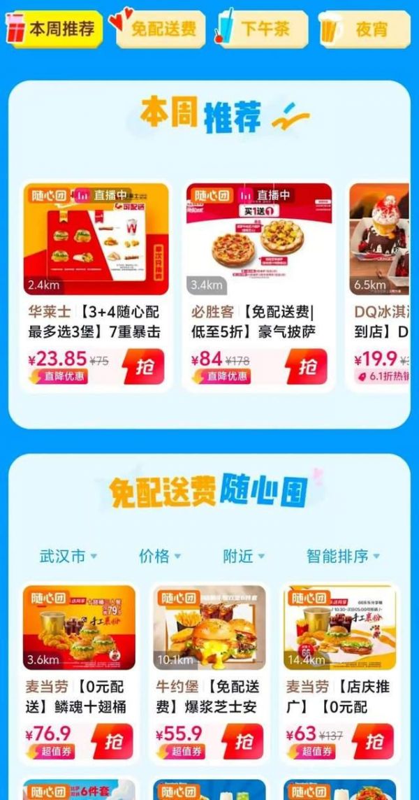 點擊“搶購”,會進入到“隨心團”頁面。頁面內(nèi)除了顯示本周推薦的活動商品,還有下午茶、夜宵等分類下的商品,部分商品支持免費配送。