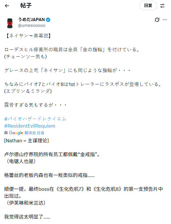 近日,推主@umesooooo在社交平臺(tái)X上發(fā)布了新發(fā)現(xiàn)的細(xì)節(jié)。推主表示,有觀點(diǎn)認(rèn)為內(nèi)森可能是幕后黑手,因?yàn)榀燄B(yǎng)院的所有工作人員(包括電鋸男)都佩戴金戒指,而格蕾絲的上司內(nèi)森也戴著同樣的戒指,此外《生化危機(jī)7》和《生化危機(jī)8》都曾在首支預(yù)告中提前展示最終Boss(伊芙琳&米蘭達(dá)),這種安排被認(rèn)為是卡普空的一貫手法,但也不排除暗示過于明顯的可能性。