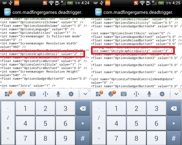 長按com.madfingergames.deadtrigger2.xml文件,然后使用文本編輯器打開,將 int name="UnityGraphicsQuality" value="0" 改為int "UnityGraphicsQuality" value="3" ,同理,再將 int name="OptionsGraphicDetail" value="1" 改為 int name="OptionsGraphicDetail" value="2" ,然后保存即可。