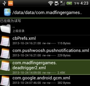 想要修改特效,首先你的設(shè)備需要已經(jīng)ROOT,然后使用文件管理器打開手機根目錄下的:data/data/com.madfingergames.deadtrigger2/shared_prefs文件夾,這里以《RE文件管理器》為例。