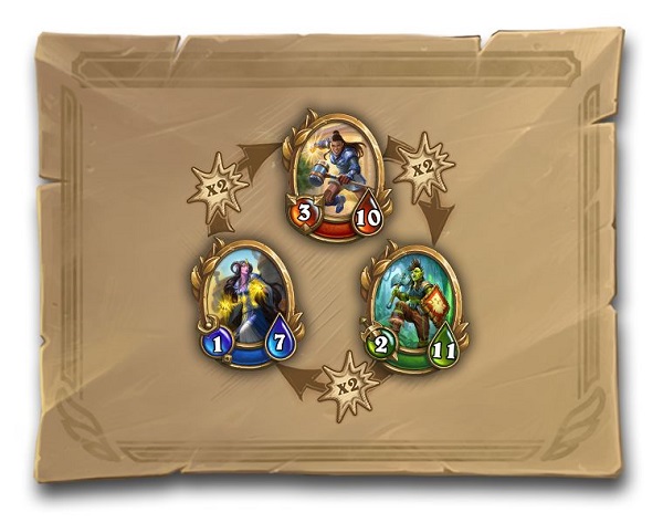在這個(gè)模式里,不同職業(yè)間是存在雙倍傷害的克制關(guān)系的,紅色護(hù)衛(wèi)克制綠色斗士,綠色斗士克制藍(lán)色施法者,藍(lán)色施法者克制紅色護(hù)衛(wèi),這種克制存在于所有的技能當(dāng)中,即不管綠色施法者是用物理技能還是法術(shù)技能,都可以對(duì)紅色護(hù)衛(wèi)造成雙倍傷害。