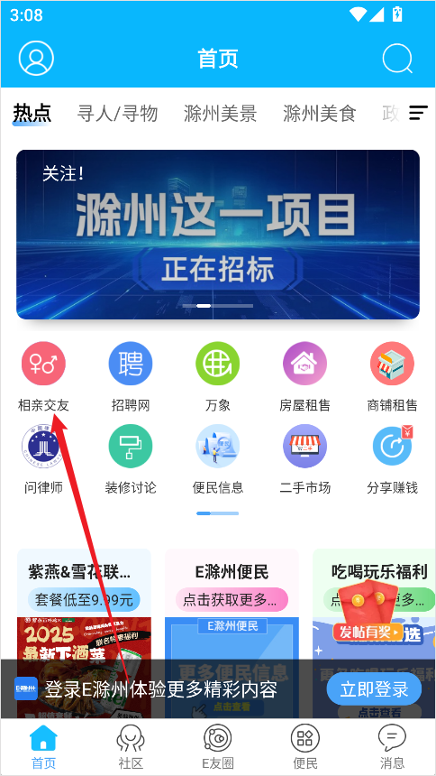 1、打開E滁州App后點擊首頁的「 相親 交友」模塊;